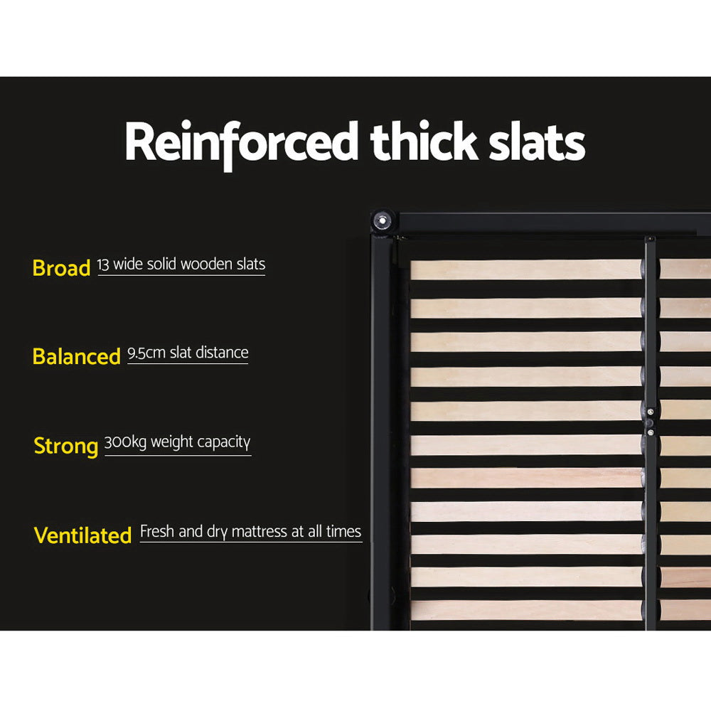Constructed with a sturdy steel frame that's reinforced with metal bars and heavy-duty connectors, the Avio Bed Frame is also padded with high density foam and upholstered in premium faux linen fabric for a soft and comfortable touch. The Bed Frame features a wooden arched slat base that helps to distribute weight evenly across the frame and a centre support strut to provide added stability to the overall structure.